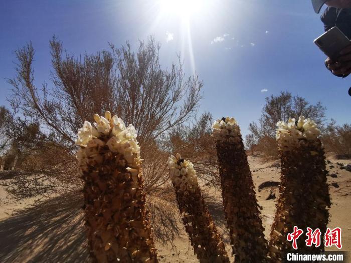 2020年5月16日,甘肅酒泉市金塔縣境內(nèi)沙漠里,梭梭林下的肉蓯蓉花開(kāi)?!∫蟠河? 攝