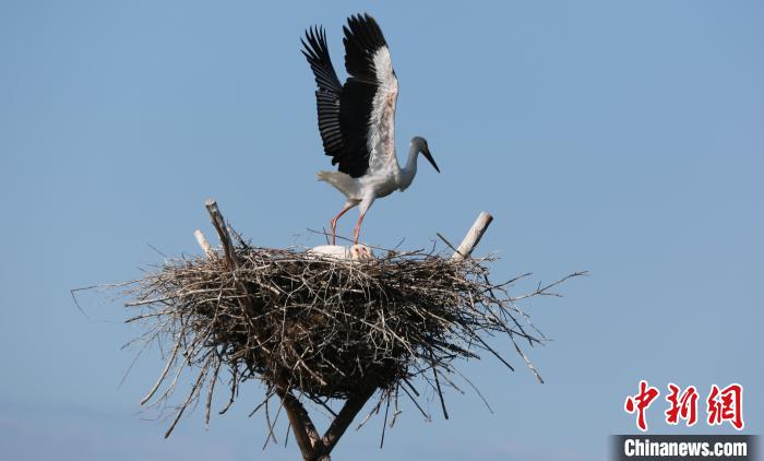 在人工巢內(nèi)的東方白鸛?!『邶埥楹訃壹壸匀槐Wo(hù)區(qū)管理局提供