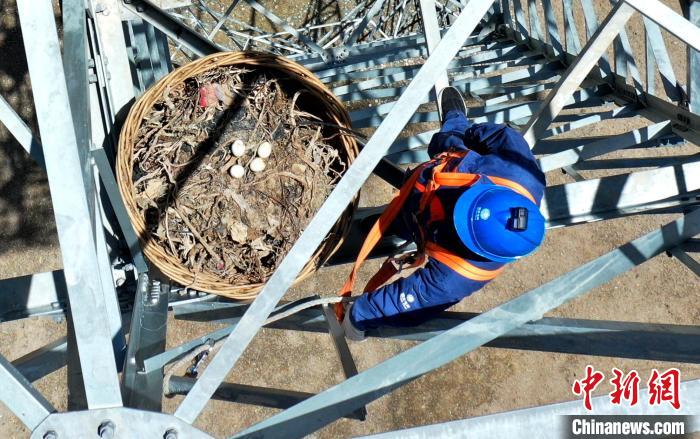 圖為國網青海省電力公司工作人員正在檢查人工鳥巢的情況。 國網青海省電力公司供圖