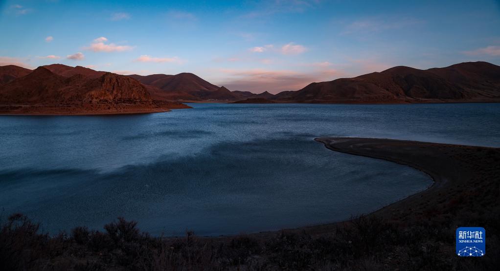 這是夕陽(yáng)下的羊卓雍錯(cuò)(1月1日攝)。新華社記者 姜帆 攝