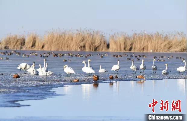 圖為大天鵝等越冬水鳥在湖邊覓食嬉戲。 青海省林草局供圖