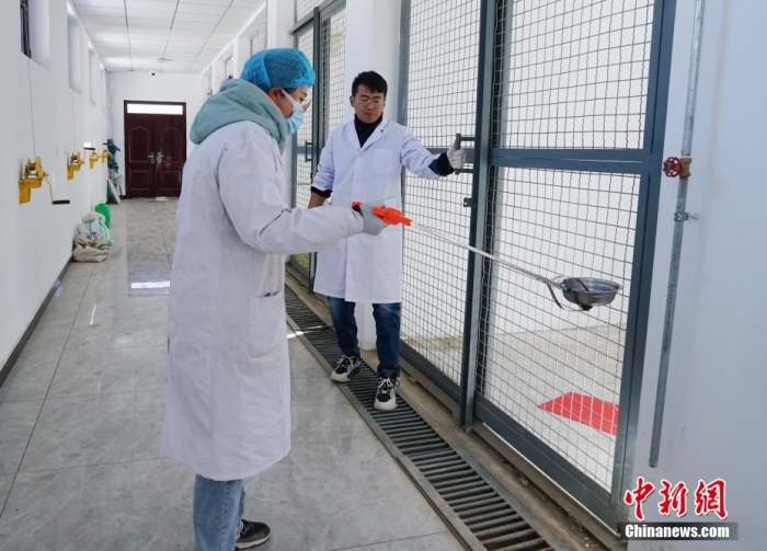 圖為1月18日,青海省祁連山國家公園野生動物救護繁育站工作人員徐豐奕正在打掃西藏馬鹿的籠舍。 中新社記者 馬銘言 攝