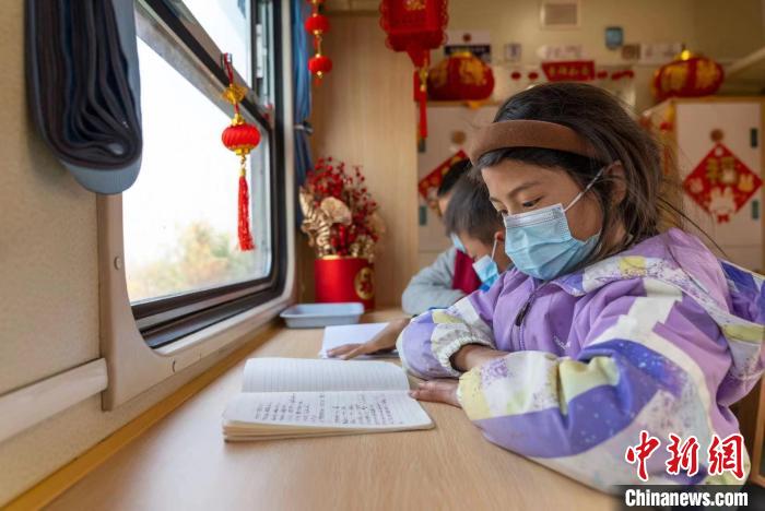 當(dāng)?shù)貙W(xué)生在“慢火車”上的學(xué)習(xí)車廂寫作業(yè)?!「惰?攝