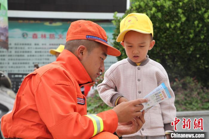 圖為森林消防隊(duì)員向小朋友講解森林火災(zāi)危害。西繞拉翁 攝