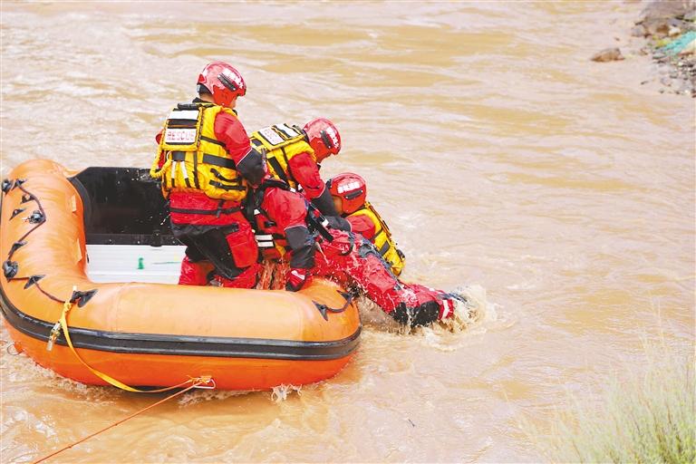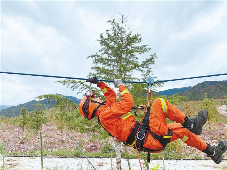 消防員模擬橫渡河流營(yíng)救“被困人員”。