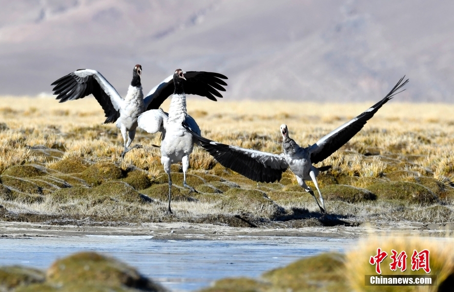 10月21日,黑頸鶴在西藏那曲市申扎縣買巴鄉(xiāng)附近的濕地“翩翩起舞”。