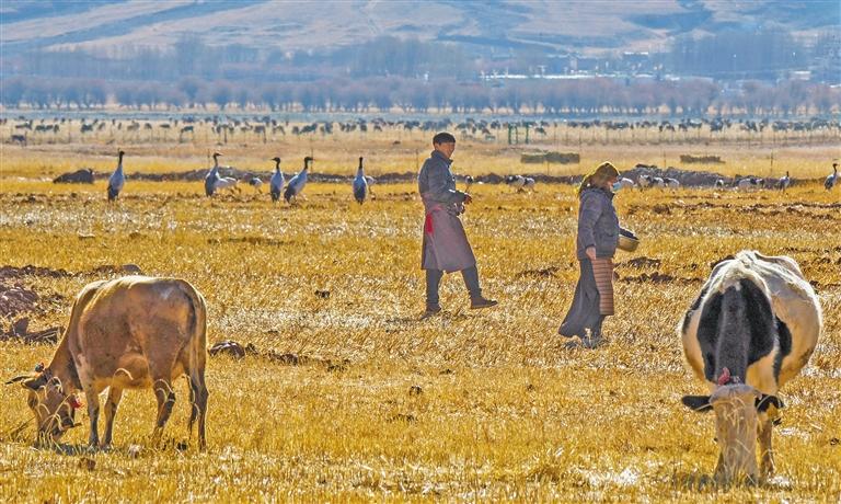卡孜濕地是其中一個(gè)投食點(diǎn)?,F(xiàn)年43歲的洛桑次旦就住在附近,每天一大早,他都會(huì)到卡孜濕地放牧?!啊従印絹碓蕉嗔耍畮啄甑臅r(shí)間,黑頸鶴的數(shù)量從幾只增長到幾百只?!甭迳4蔚└嬖V記者,黑頸鶴和牛各吃各的,互不干擾,非常和諧。