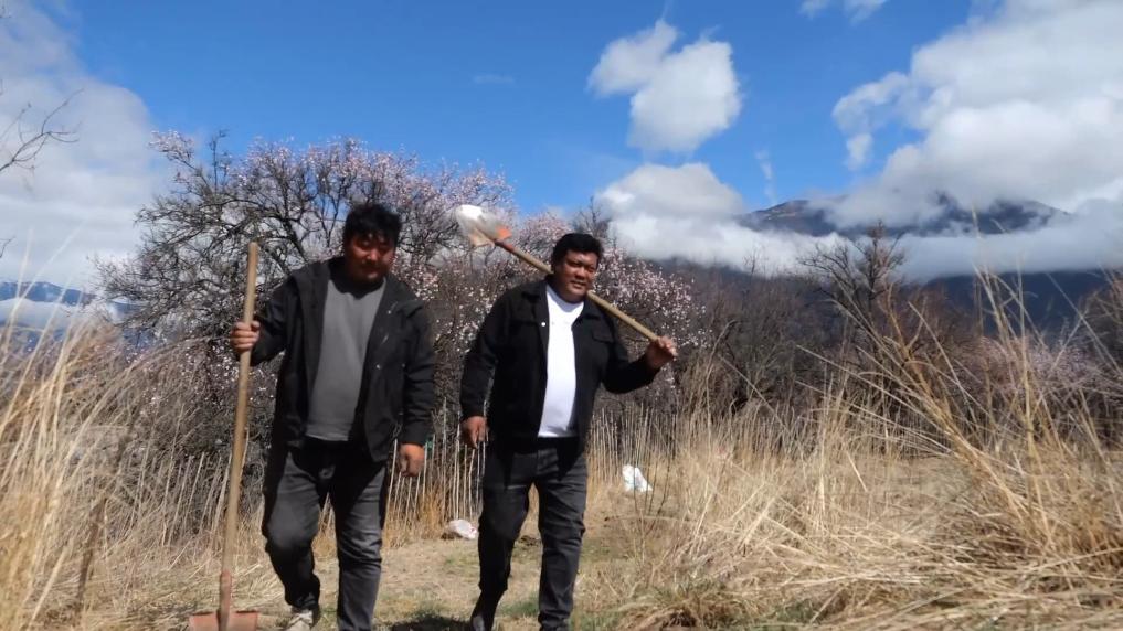早春,雪域高原逐漸從寒冬中復(fù)蘇。西藏林芝的山林之中,桃花如云霞般綻放。一片芳菲景象中,新一年的生機與繁榮正在孕育。這天一早,羌渡崗村的兩名干部又一次來到了他們牽掛的村集體果園,查看長勢,整理土地。