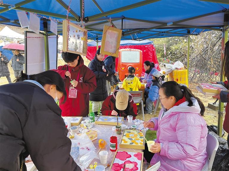 察隅縣桃花節(jié)的DIY活動(dòng)現(xiàn)場(chǎng),參與者將盛開的桃花作為美術(shù)素材融入自己制作的肌理畫中。