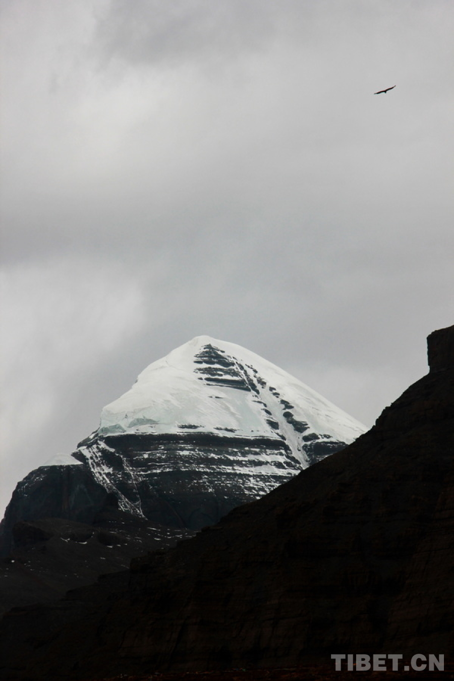 圖為雄鷹飛過(guò)位于西藏自治區(qū)阿里地區(qū)普蘭縣巴嘎鄉(xiāng)的岡仁波齊 攝影:劉莉