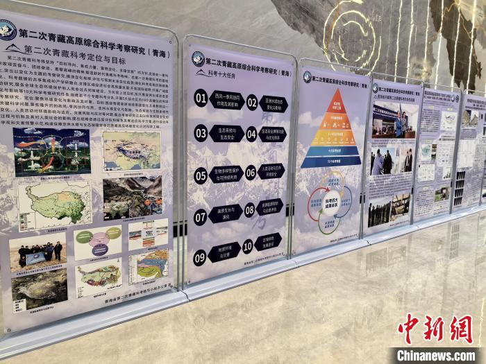 圖為第二次青藏科考成果助推青海交通高質(zhì)量發(fā)展對接會(huì)場外展板,展示科考項(xiàng)目?!∑钤鲚頂z
