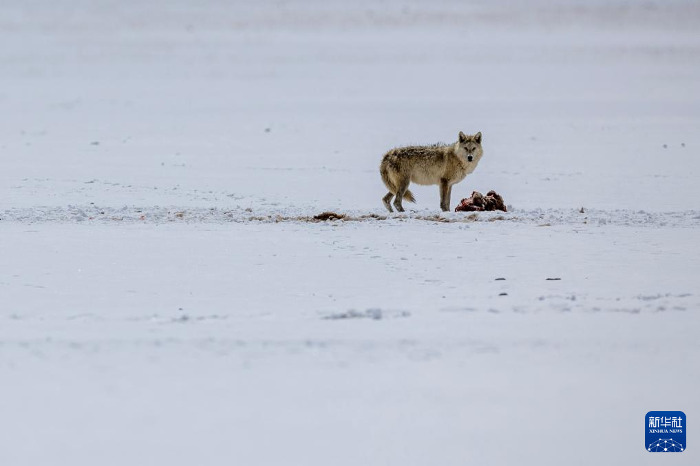 在西藏那曲市尼瑪縣境內(nèi)的羌塘國家級(jí)自然保護(hù)區(qū)核心區(qū),一只狼在進(jìn)食(5月9日攝)。新華社記者 姜帆 攝