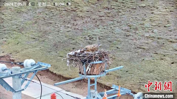 圖為監(jiān)控畫面顯示:5月21日,在青海玉樹藏族自治州嘉塘草原,10千伏珍一路的67桿塔上,一只大鵟正在孵化幼鳥。國網(wǎng)青海省電力公司供圖