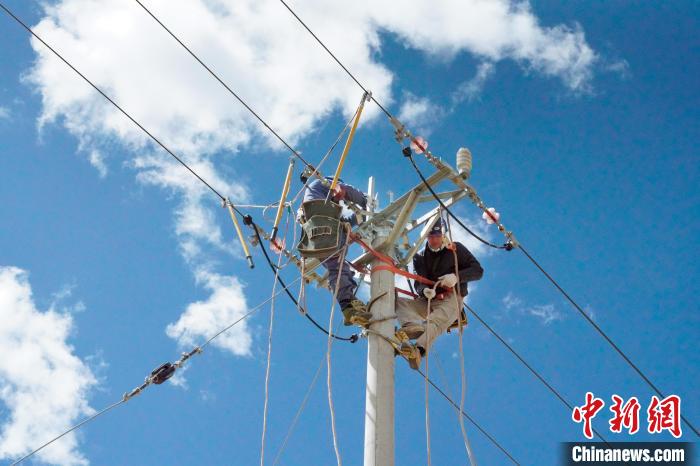 圖為電力人員正在架設(shè)鳥巢。國網(wǎng)青海省電力公司供圖