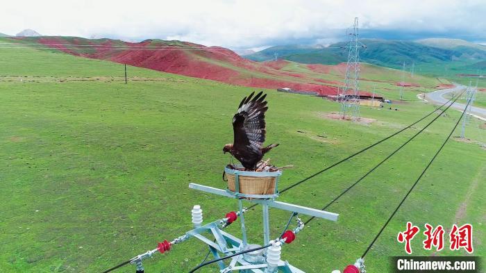 21日,在青海玉樹藏族自治州嘉塘草原,10千伏珍一路的67桿塔上,一只大鵟正在人工鳥巢內(nèi)孵化幼鳥。鳥巢下方,國網(wǎng)玉樹供電公司運維檢修人員正在開展巡檢工作。