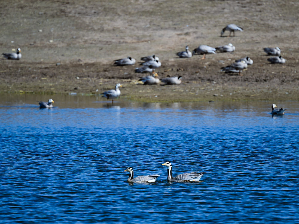 這是2024年5月26日在長江源頭地區(qū)的班德湖畔拍攝的斑頭雁。新華社記者 張龍 攝