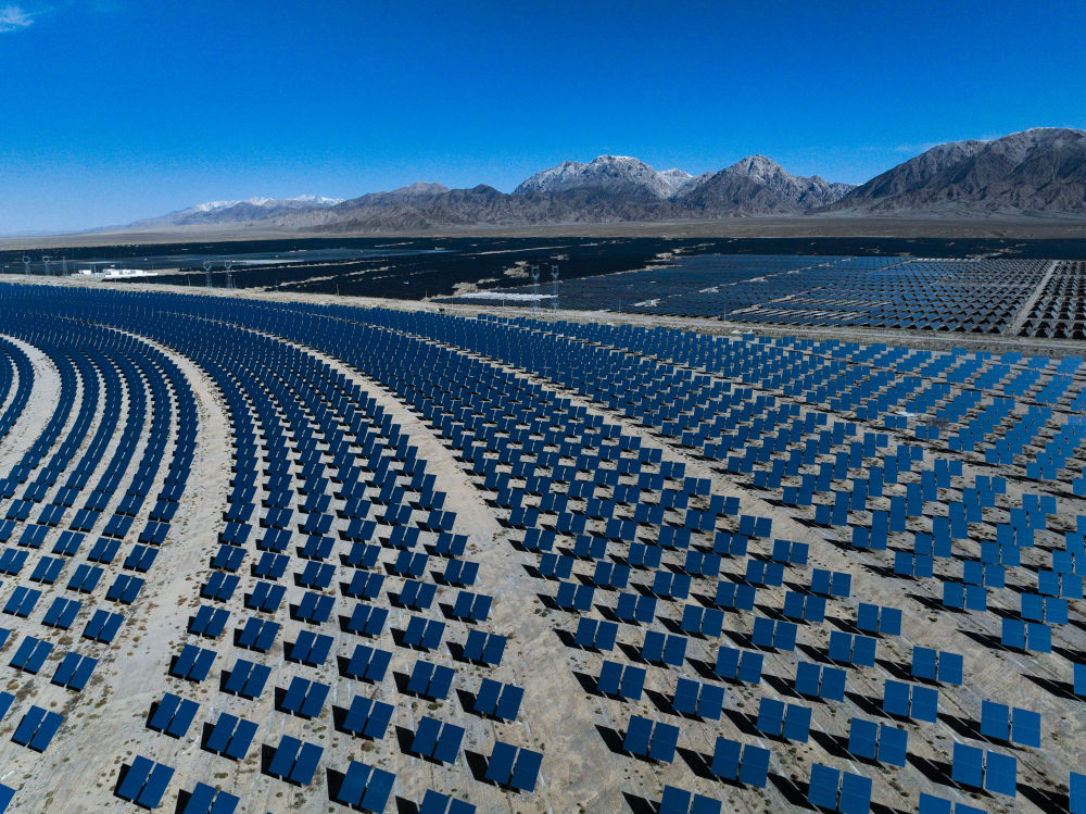 345平方公里的發(fā)電園內(nèi),超過1000萬塊光伏板高低起伏連成蔚藍(lán)色的“海洋”,年發(fā)電量超過200億千瓦時(shí),相當(dāng)于減排二氧化碳超過2122萬噸。