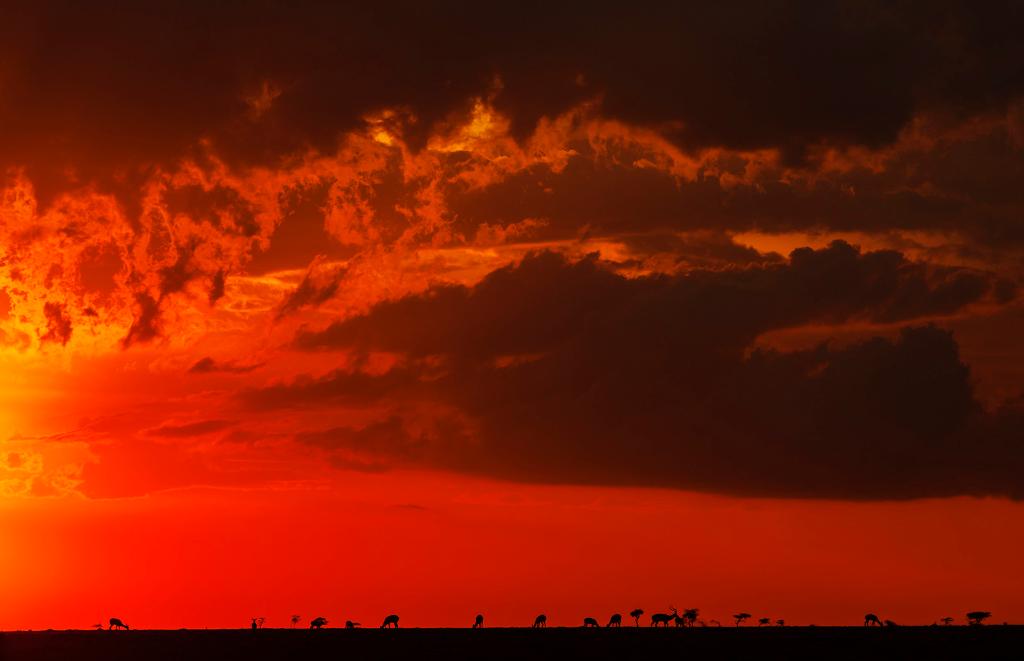 在馬賽馬拉國家保護區(qū),遷徙中的野生動物在夕陽下覓食。