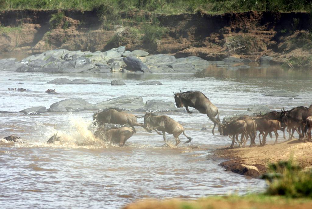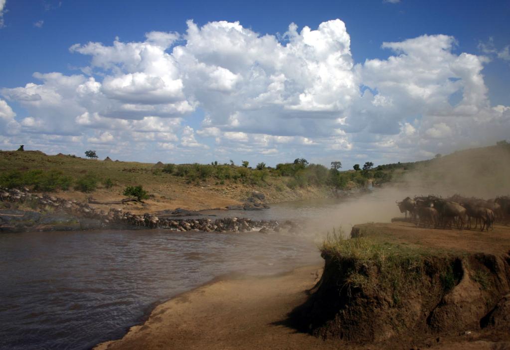 在馬賽馬拉國家保護區(qū),遷徙中的角馬越過馬拉河。