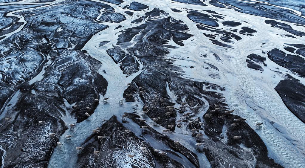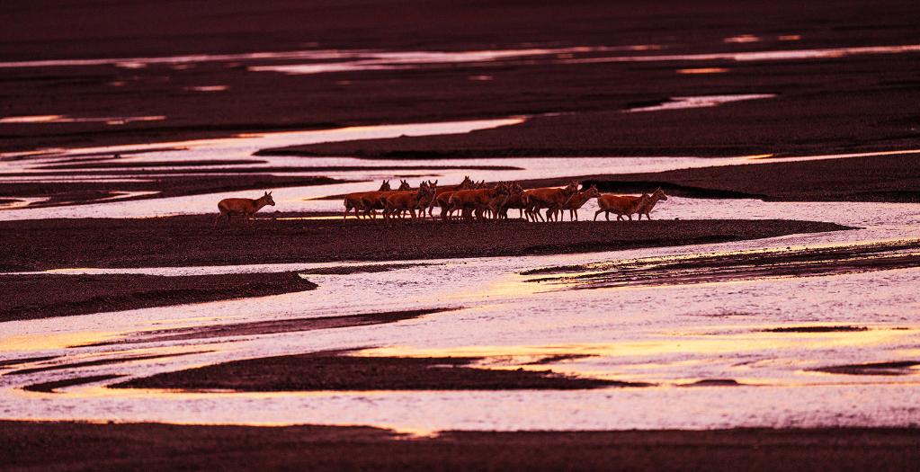 在羌塘國家級自然保護區(qū),藏羚羊越過甜水河,前往“產(chǎn)房”。