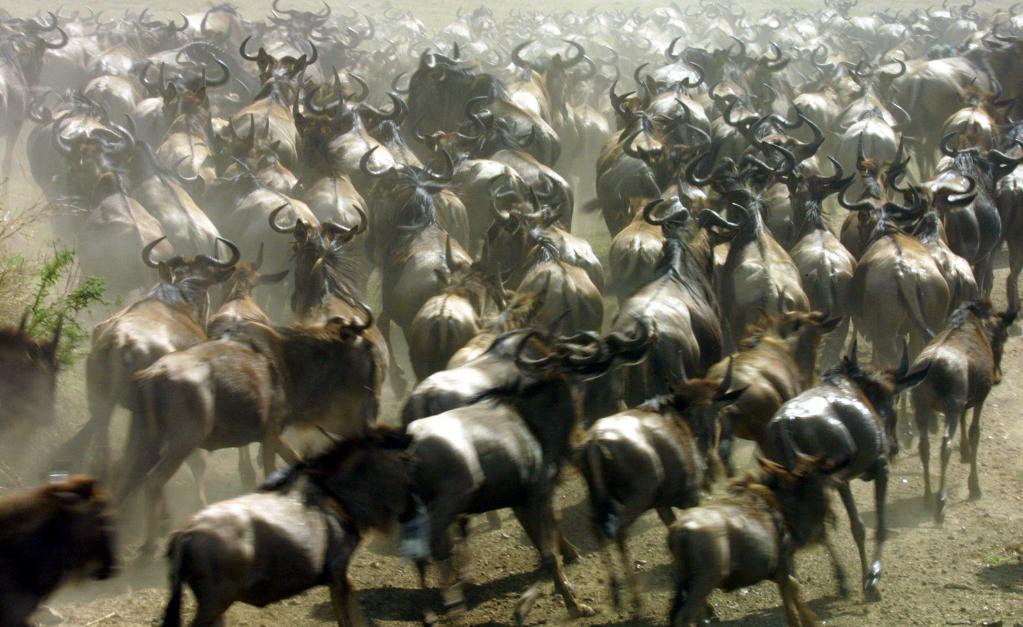 在千里之外的非洲,每年7月至9月,為了追逐水源和青草,數(shù)百萬頭角馬、斑馬和羚羊等食草動物組成一支浩浩蕩蕩的遷徙大軍,從坦桑尼亞塞倫蓋蒂國家公園向肯尼亞馬賽馬拉國家保護區(qū)遷徙,這就是東非野生動物大遷徙。當(dāng)數(shù)百萬頭野生動物從面積廣闊達數(shù)萬平方公里的塞倫蓋蒂,遷徙到僅有不到2000平方公里的馬賽馬拉的時候,遷徙達到高潮。