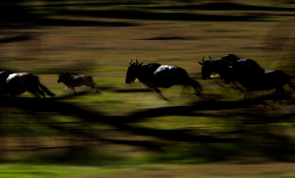 在馬賽馬拉國家保護區(qū),遷徙中的角馬因為感受到某種危險而奮力奔跑。