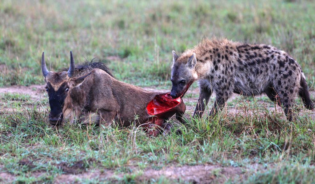 在馬賽馬拉國家保護區(qū),一頭遷徙中的角馬成了鬣狗的食物。在角馬遷徙過程中,獅子、獵豹、花豹、鬣狗以及馬拉河中的鱷魚等掠食動物環(huán)伺其周,伺機而動。