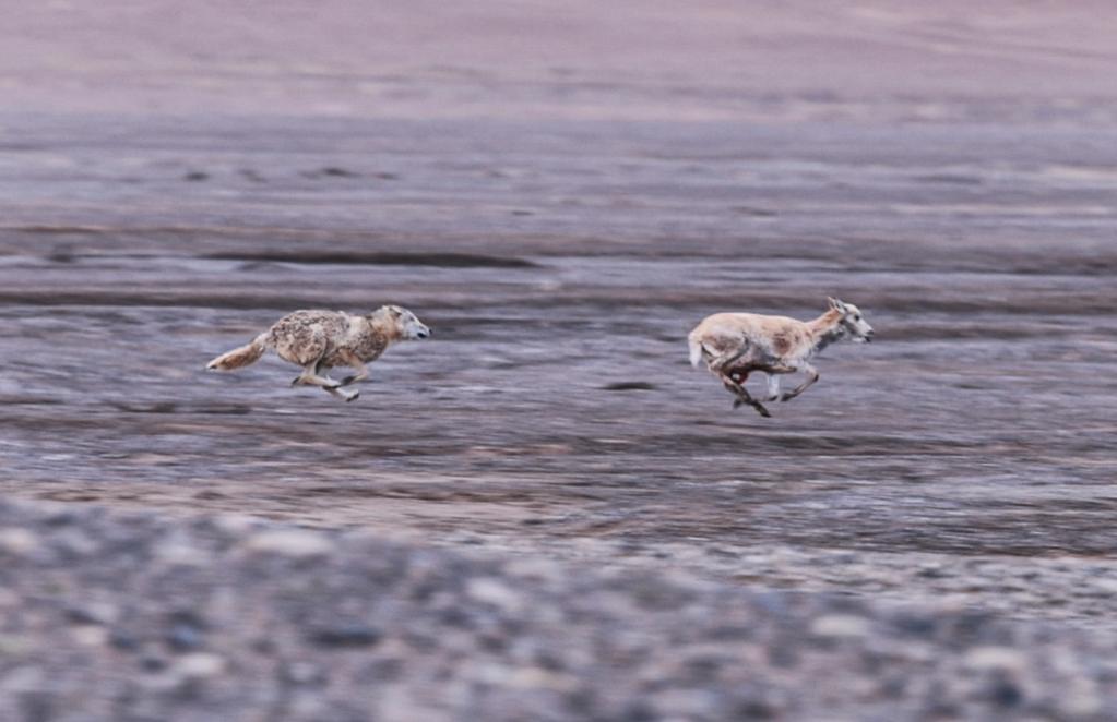 在羌塘國家級自然保護區(qū),一只野狼正在捕食遷徙中的母藏羚羊。在藏羚羊的遷徙過程中,野狼、雪豹、藏馬熊和藏野狐等掠食動物守候在遷徙路上,隨時準(zhǔn)備捕食。