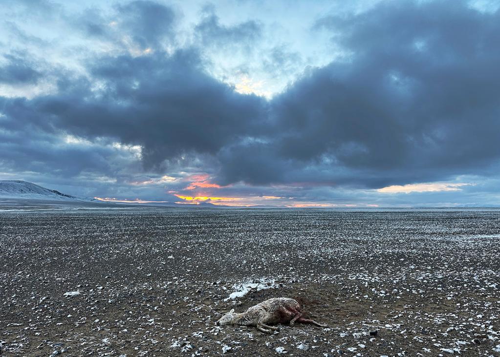 在羌塘國家級自然保護區(qū),一只被野狼咬死的母藏羚羊躺在雪后的草原上。