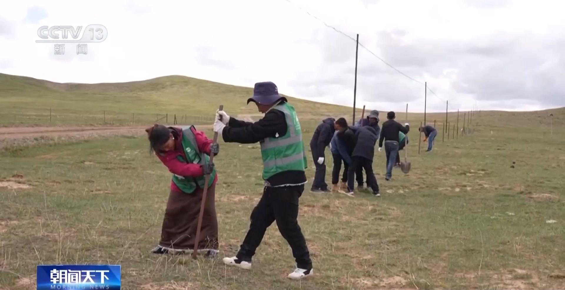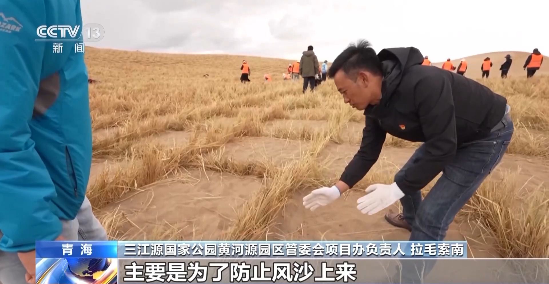 三江源國(guó)家公園黃河源園區(qū)管委會(huì)項(xiàng)目辦負(fù)責(zé)人 拉毛索南:草方格整體打好以后,把草籽灑在這些中間里面,它就主要是為了防止風(fēng)沙上來(lái),把草籽埋得更深。