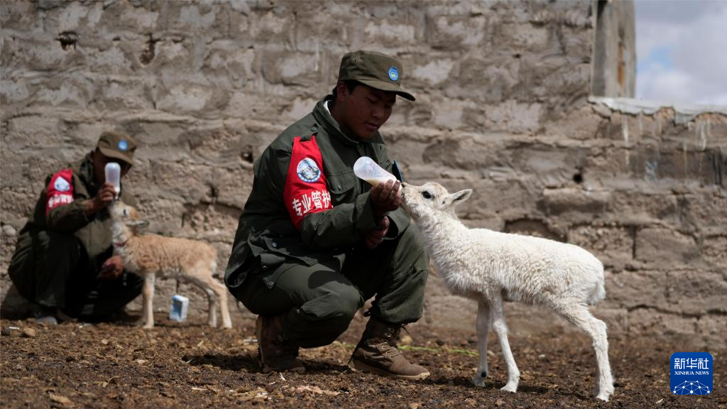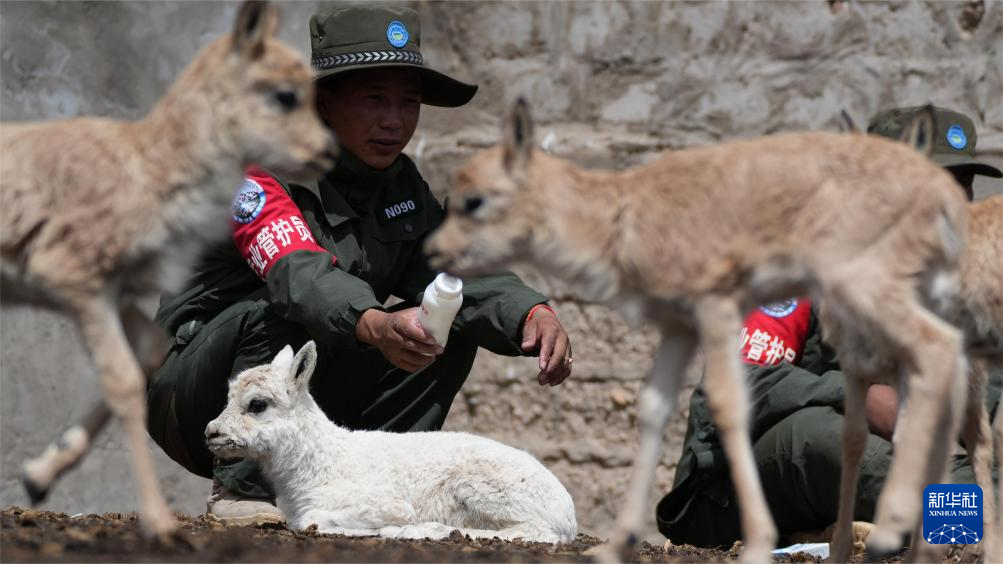 尼瑪縣措羅木管護(hù)站野保員在給白色藏羚羊幼崽喂奶(7月13日攝)。新華社發(fā)(旦增攝)