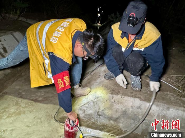 如墨的夜色下,經(jīng)過(guò)2個(gè)小時(shí)的連續(xù)抽水,排水溝的大部分積水被抽出,職工們頭戴照明燈,手握鐵鍬一字?jǐn)[開(kāi),開(kāi)始深一腳淺一腳,清理溝底淤泥,道道搖曳不定的光柱,在靜默的夜空下閃爍交織。