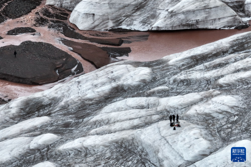 7月25日,在冬克瑪?shù)妆?,科考隊員在探測冰川(無人機照片)。新華社記者 伍志尊 攝