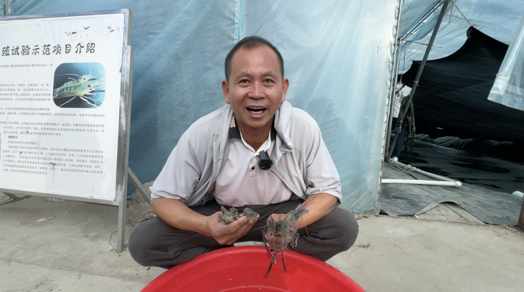 林芝農(nóng)墾嘎瑪農(nóng)業(yè)有限公司副總經(jīng)理駱明飛展示剛捕撈上來(lái)的鮮蝦。新華社記者王洪流 攝