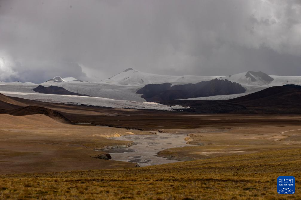 這是9月4日拍攝的普若崗日冰原8號冰川、消融形成的徑流以及遠(yuǎn)處的令戈錯(無人機(jī)拼接照片)。新華社記者 姜帆 攝