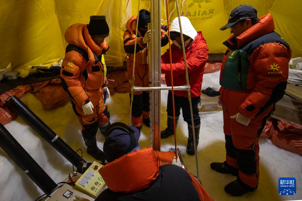 徐柏青(右二)和同事從鉆頭中取出鉆取的冰芯(9月11日攝)。新華社記者 姜帆 攝