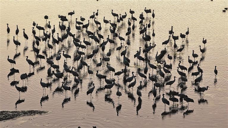 黑頸鶴是全球15種鶴類中唯一在高原地區(qū)生活、繁殖的鶴類,屬國家一級(jí)保護(hù)動(dòng)物。每年10月中下旬,大批黑頸鶴從藏北高原飛到拉薩河谷,它們?cè)谵r(nóng)田、沼澤地里覓食嬉戲,享受冬日暖陽。