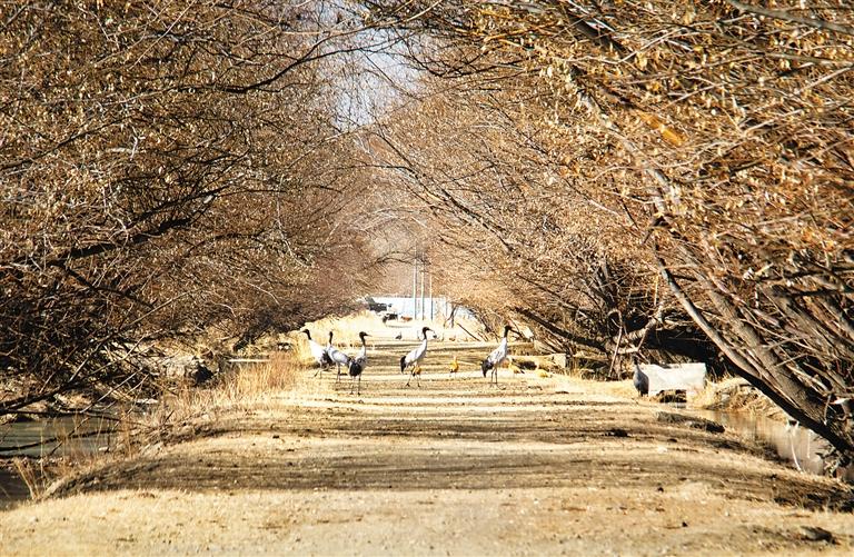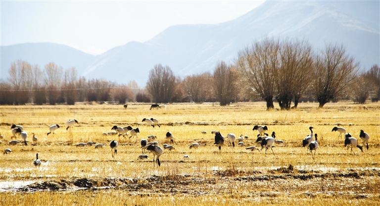 位于雅魯藏布江與年楚河交匯處的日喀則市桑珠孜區(qū)邊雄鄉(xiāng),是黑頸鶴的越冬地之一。這里有廣袤的農(nóng)田和濕地,黑頸鶴可在此覓食、過冬。