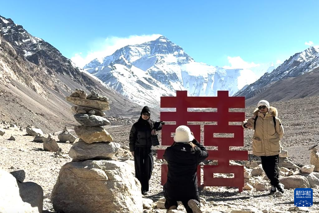 11月20日,游客在珠峰景區(qū)的“囍”字前拍照留影。新華社記者 邱星翔 攝