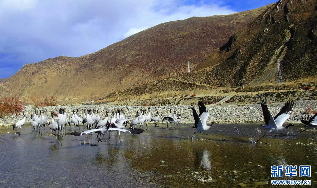 圖為黑頸鶴在湖邊嬉戲(11月24日攝)。新華網(wǎng)發(fā) 嘎色攝