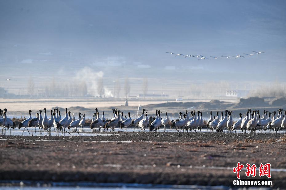 11月27日晨,西藏自治區(qū)拉薩市林周縣黑頸鶴保護(hù)區(qū)內(nèi),大量越冬的黑頸鶴在虎頭山水庫(kù)覓食、嬉戲。林周縣位于拉薩河上游及澎波河流域,平均海拔約4200米,是黑頸鶴的主要越冬地之一。