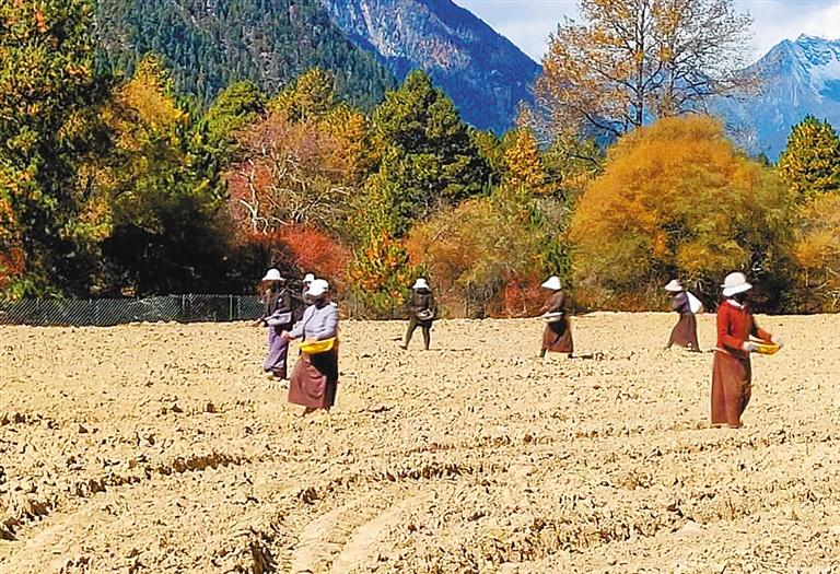 林芝市群眾在田間開(kāi)展播種作業(yè)。