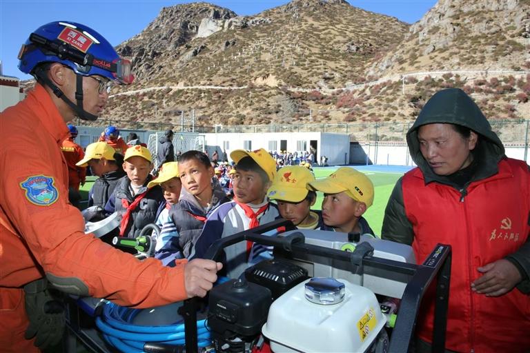 消防員向師生普及地震應急避險常識。記者 格桑倫珠 通訊員 仁青卓瑪 攝