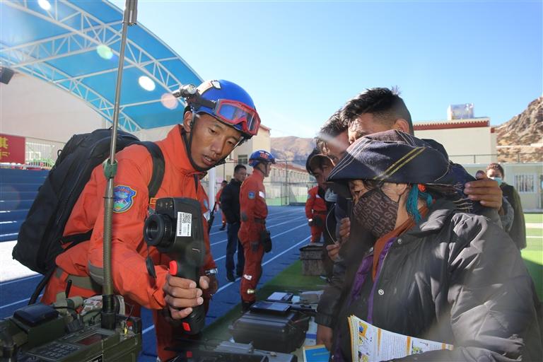 消防員向群眾介紹地震應急設備功能。記者 格桑倫珠 通訊員 仁青卓瑪 攝