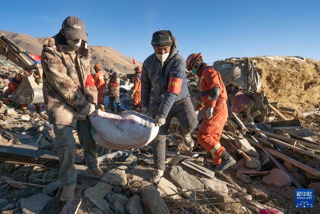 1月13日,在定日縣長所鄉(xiāng)古榮村,消防員們在搬運從次仁扎西老人家里搶救出的青稞。新華社記者 丁增尼達 攝