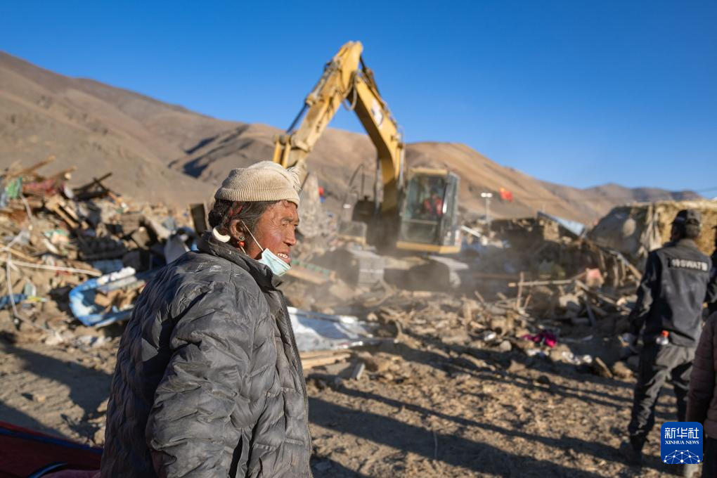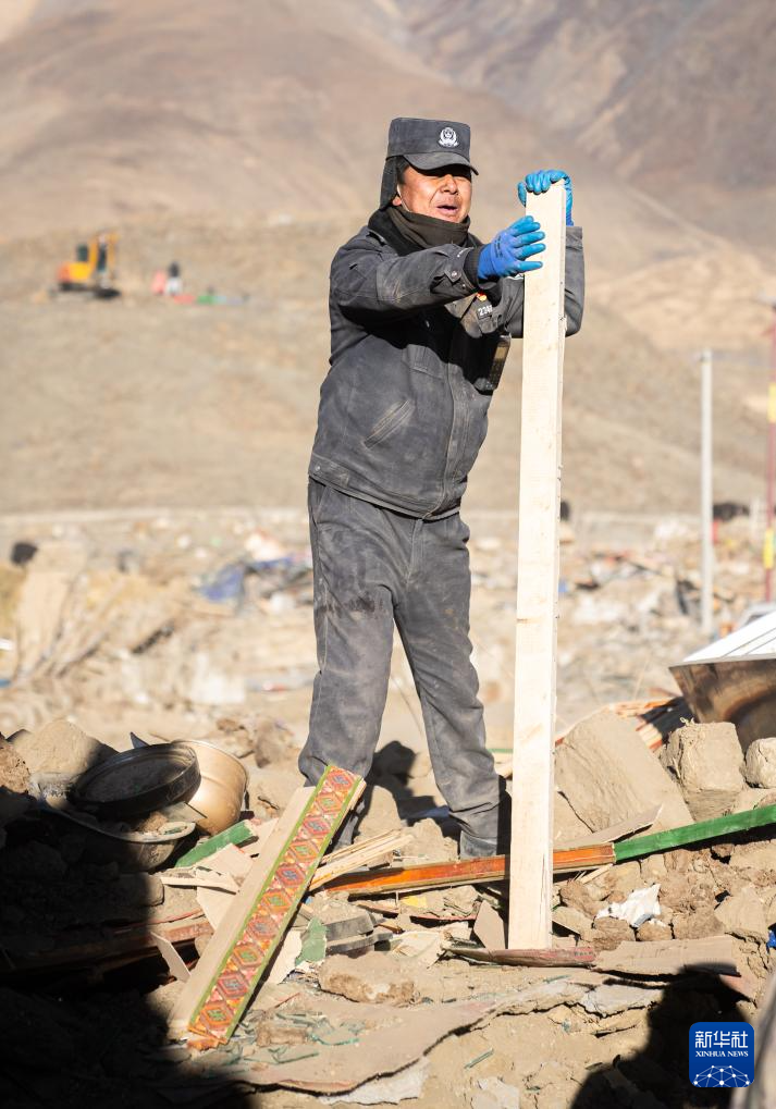 1月13日,在定日縣長所鄉(xiāng)古榮村,邊巴桑珠在指揮房屋廢墟清理工作。新華社記者 丁增尼達 攝