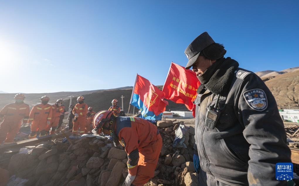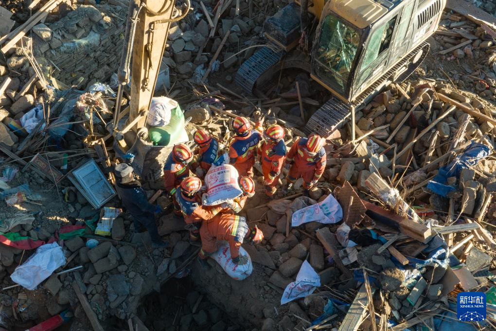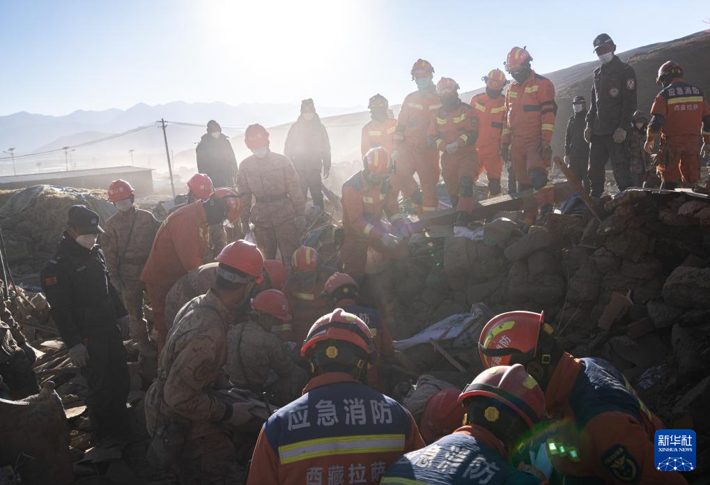 1月13日,在定日縣長所鄉(xiāng)古榮村,消防員、武警官兵和公安干警在搜尋次仁扎西老人家里的青稞。新華社記者 丁增尼達 攝