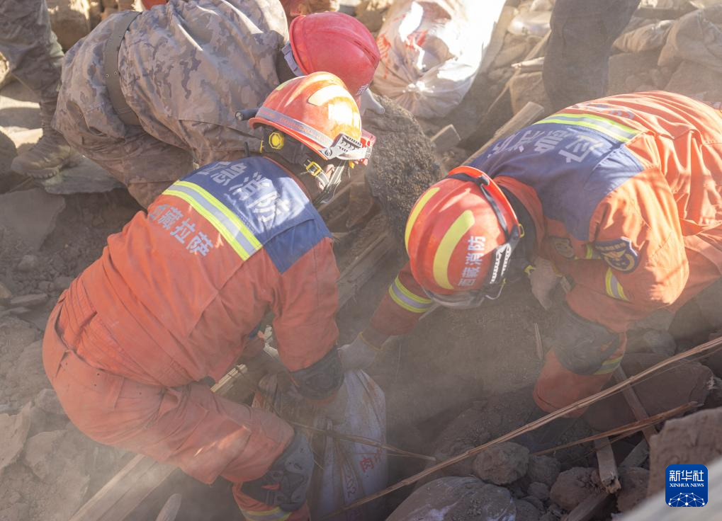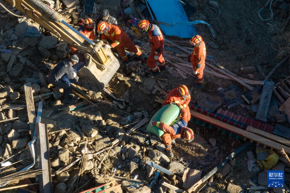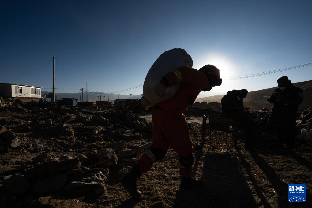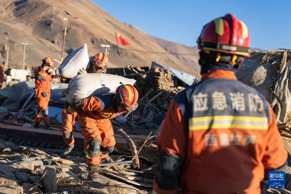 1月13日,在定日縣長所鄉(xiāng)古榮村,消防員在搬運搶救出來的青稞。新華社記者 丁增尼達 攝