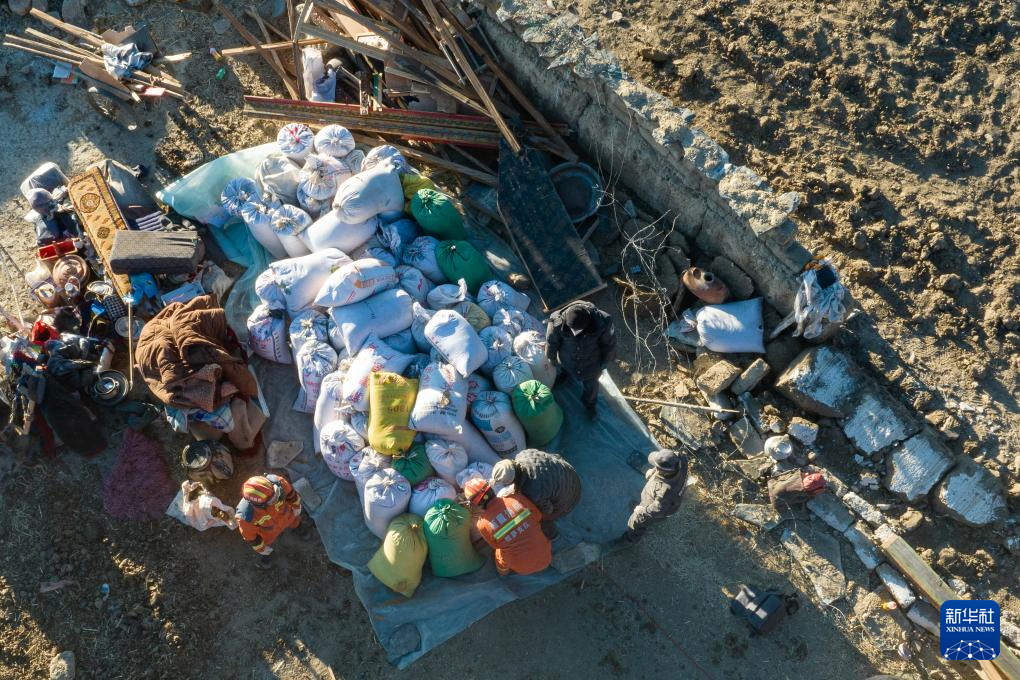 1月13日,在定日縣長所鄉(xiāng)古榮村,搶救出的70多袋青稞堆放在角落(無人機照片)。新華社記者 丁增尼達 攝