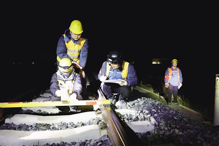 漆黑的夜晚,空曠的鐵道線上,只有測(cè)量時(shí)的對(duì)話聲和對(duì)講機(jī)里的聯(lián)控聲。4名工作人員各司其職,迎著呼嘯的冷風(fēng),借助頭燈的亮光,仔細(xì)檢查接觸網(wǎng)的各個(gè)部件,并認(rèn)真測(cè)量記錄接觸網(wǎng)補(bǔ)償裝置等關(guān)鍵參數(shù)。
